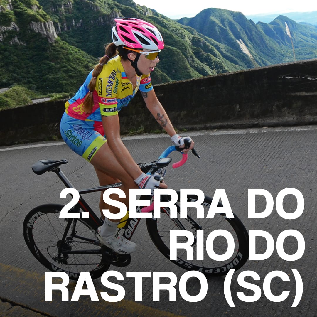 “Outro lugar que eu gosto bastante de treinar, de onde tenho marca de tombo da subida até hoje, é a serra do Rio do Rastro, em Santa Catarina. Exige um planejamento para ir, mas é um lugar mágico, lindo e desafiador. E lá na região também tem outras serras como o morro do Corvo Branco, o morro da Igreja, que também é uma subida com várias rampinhas. A viagem para lá é maravilhosa, não é caro para ir, tipo padarias, restaurantes, se quiser gastar pouco você gasta.”