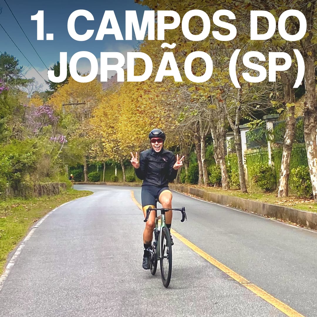 “Minha primeira dica é a região toda de Campos do Jordão. É o meu lugar preferido hoje, no Brasil, para treinar. Eu morava em São Paulo e me mudei para cá só para treinar. Tem um plano de 30 km para fazer o trabalho de força, sprint, passada, e tem a serra de Campos, que são 20 km. Nessa região, também pode pegar outras entradinhas, tem a subida do Turiba, Renópolis, a serra Velha, e indo um pouco mais para o outro lado tem a serra de Monteiro Lobato, a parte de rampas nos Melos, as subidas do Itapeva, que exigem mais potência, então você treina várias capacidades. Eu saio da minha casa e faço toda essa volta, um treino de cinco a seis horas, tranquilamente sozinha, não tem perigos.”