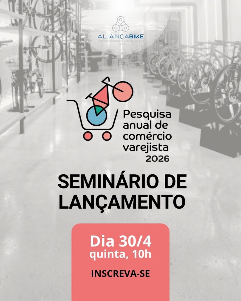 A Aliança Bike – Associação Brasileira do Setor de Bicicletas convida para o Seminário sobre Comércio Varejista de Bicicletas no Brasil 2026. Além de um debate com especialistas e com as principais empresas do mercado de bicicletas, o evento marcará o lançamento dos seguintes estudos: